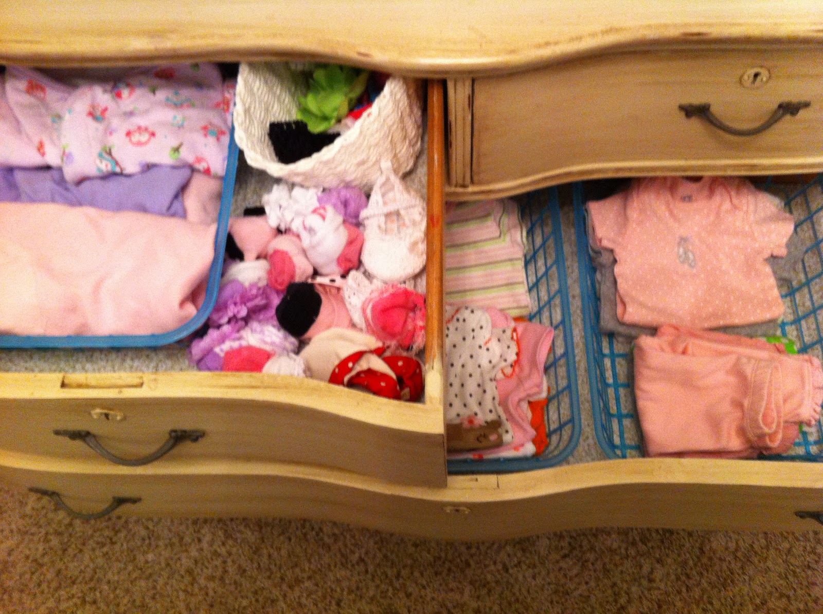 In her drawers, I put onesies and pants in bins by size (these came from Dollar Tree and fit perfectly! I was so pleased.) with smallest to largest left to right.